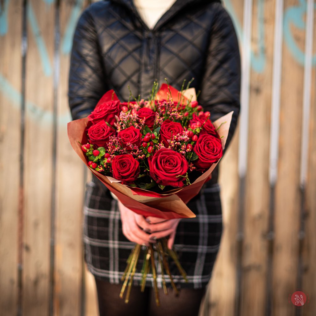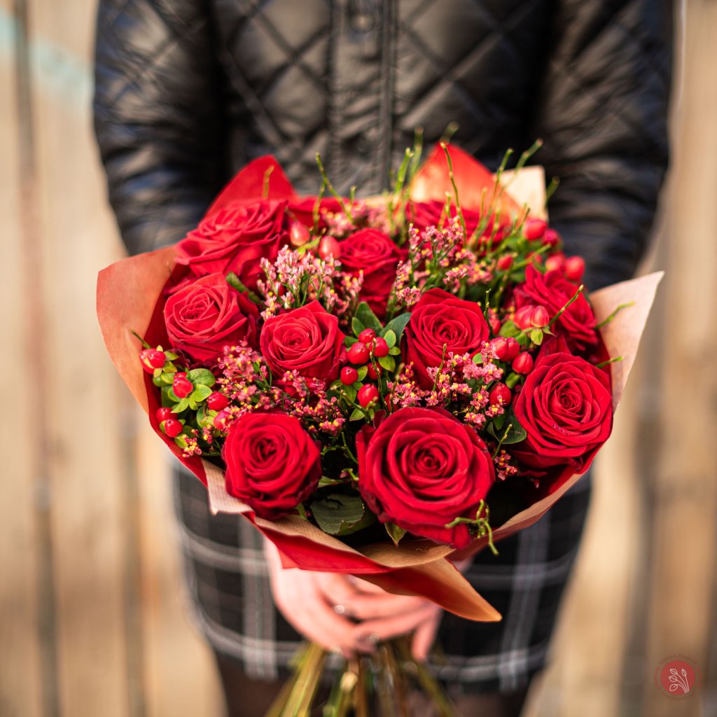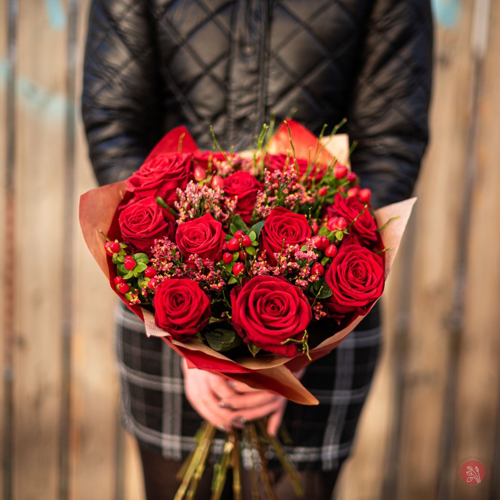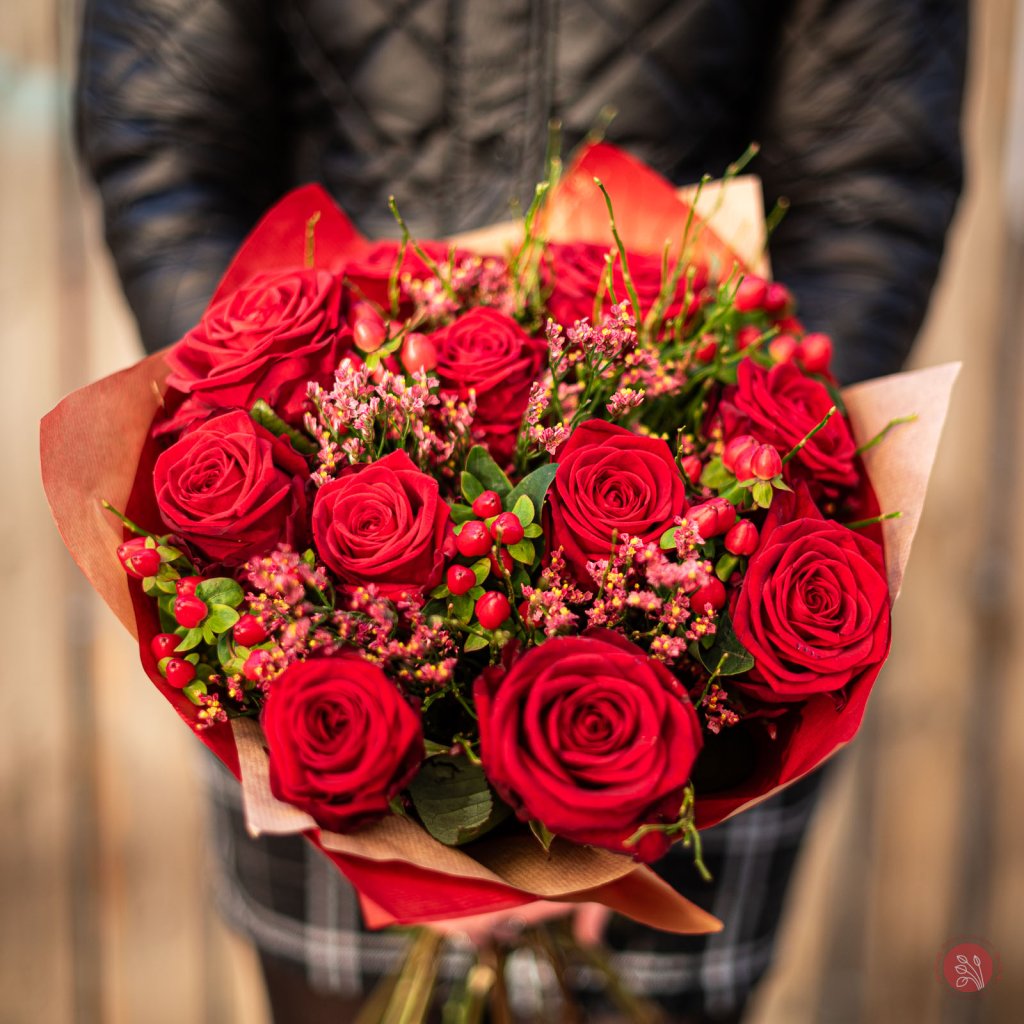 Tato nádherná kytice je mistrovským spojením klasické krásy a moderní elegance, ideální pro vyjádření hlubokých emocí nebo jako dárek k významné příležitosti. V srdci kytice královsky dominují plnokrevné červené růže, symbolem vášnivé lásky a obdivu, které jsou dokonale doplněny drobnými květy třezalky, přidávajícími texturu a kontrast. Zářivě červené bobule staticí a jemně zelené listy borůvčí pak vnášejí do kompozice živý pocit svěžesti a vitality. Celá kytice je ručně vázaná a zabalena do elegantního papíru, což zdůrazňuje její luxusní charakter. Ať už chcete udělat radost rodině, přátelům, nebo obzvláště milované osobě, s touto kyticí zaručeně vykouzlíte úsměv na tváři a necháte trvalý dojem.