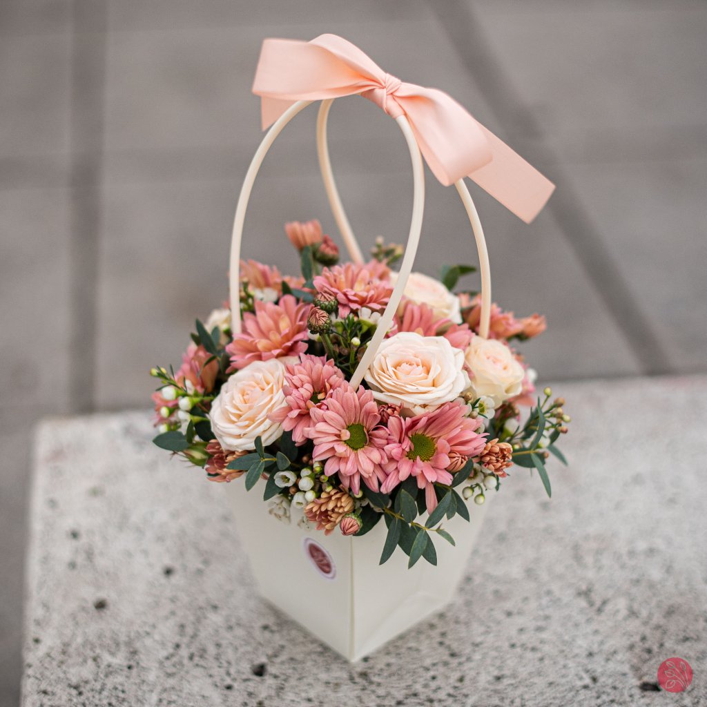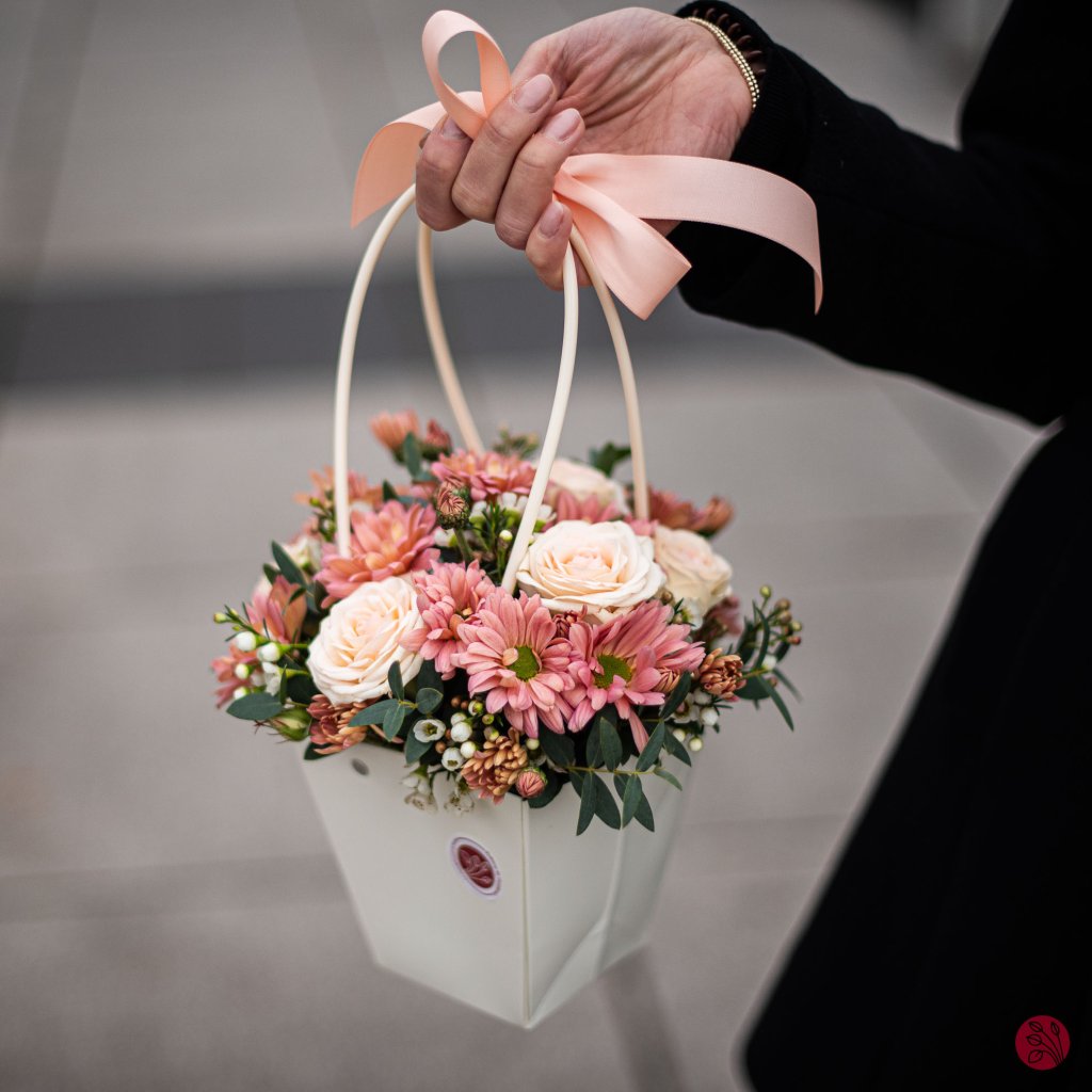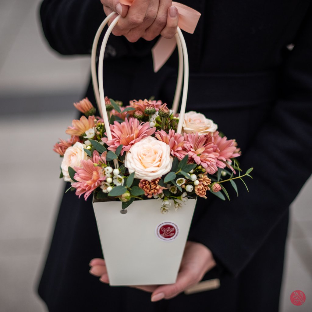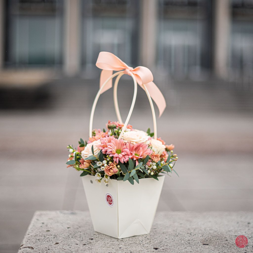 Roztomilý lososový květinový boxík s uchem je ideální malá pozornost „jen tak“, k narozeninám i jako poděkování. Lososové chryzantémy doplňují krémové růže v jemném lososovém tónu, drobný wax flower a eukalyptus – dohromady působí svěže, něžně a přirozeně.