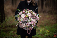 Kombinace pryskyřníků a sasanek v růžovo-krémových odstínech je téměř „učebnicový“ příklad romantické zimní kytice. Doplněná o růžovou gypsophilu a bílé, jakoby jinovatkou pokryté větvičky působí velmi křehce, ale zároveň bohatě.